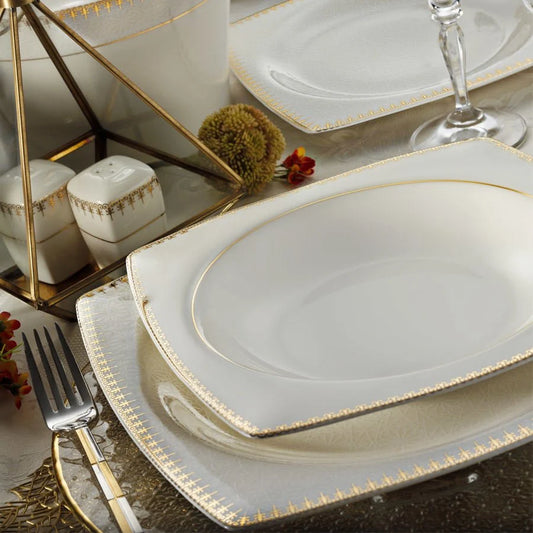 Kütahya Porcelain Bone Mare Patterned 62 Piece Porcelain Dinner Set for 12 People, White/Gold