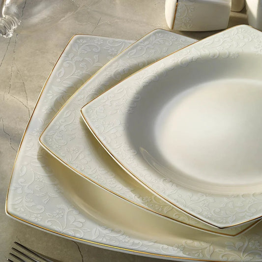 Kütahya Porcelain Bone Mare Soft Floral Patterned 62 Piece Porcelain Dinner Set for 12 People, Gold