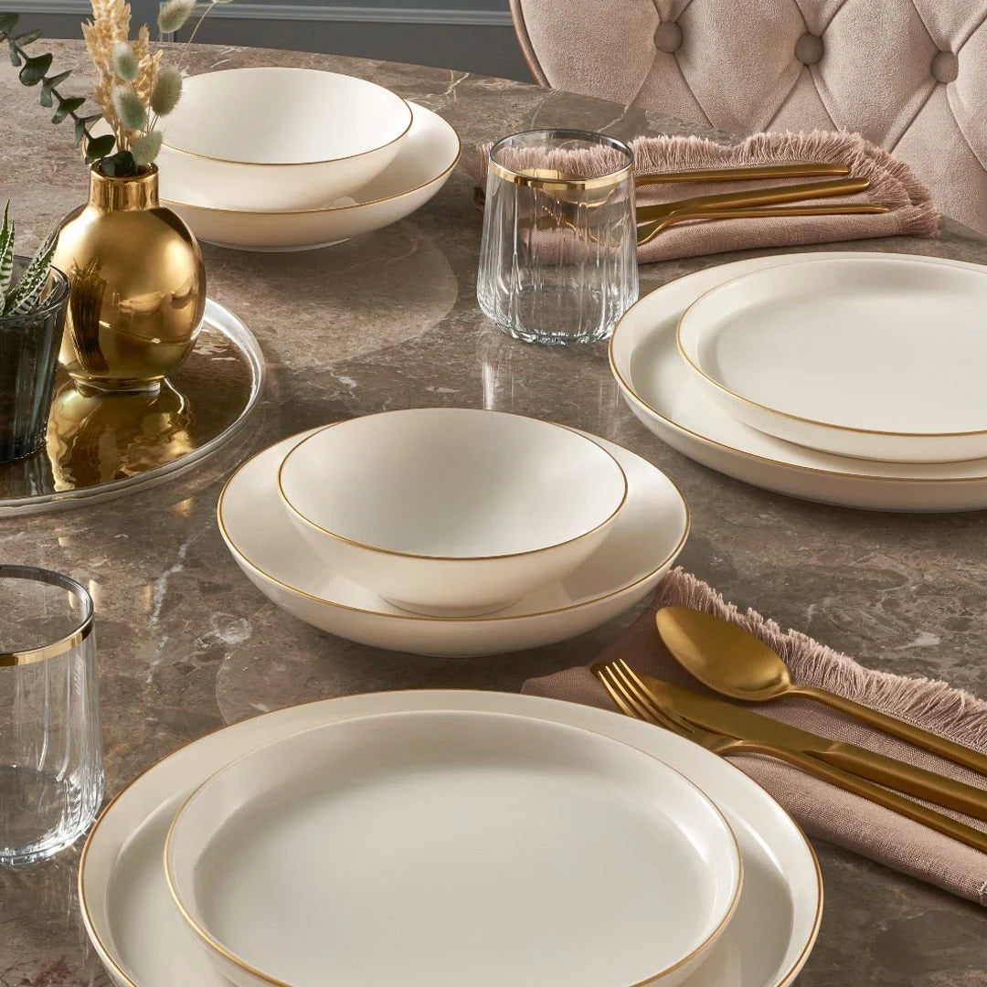Güral Porselen Bilbao 24 Piece Porcelain Dinner Set for 6 People, Cream/Gold