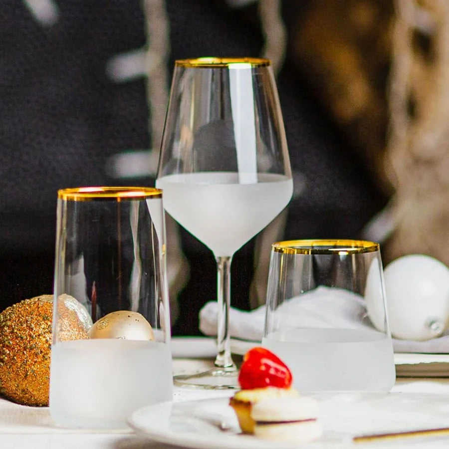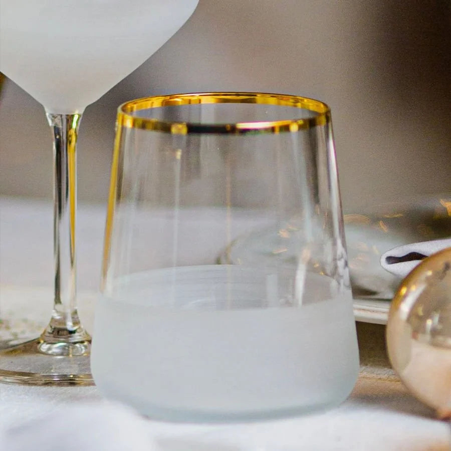 This elegant set of tumbler glasses feature a frosted bottom half and a gold rim detail.